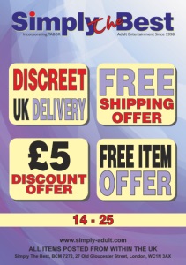 14 - 25 SHIPPING OFFER FREE UK DELIVERY DISCREET £5 DISCOUNT OFFER FREE ITEM OFFER Incorporating TABOR Adult Entertainment Since 1998 www.simply-adult.com ALL ITEMS POSTED FROM WITHIN THE UK Simply The Best, BCM 7272, 27 Old Gloucester Street, London, WC1N 3AX